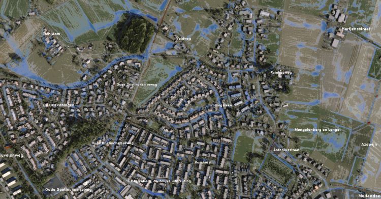 De digital twin die wordt gebruikt voor het NDTL stelt ons dus in staat om simulaties en impactanalyses uit te voeren. Voor verschillende klimaatscenario’s zijn simulaties uitgevoerd voor heel Nederland. De digital twin die hiervoor wordt gebruikt, is ontwikkeld door het Tygron Geodesign Platform.