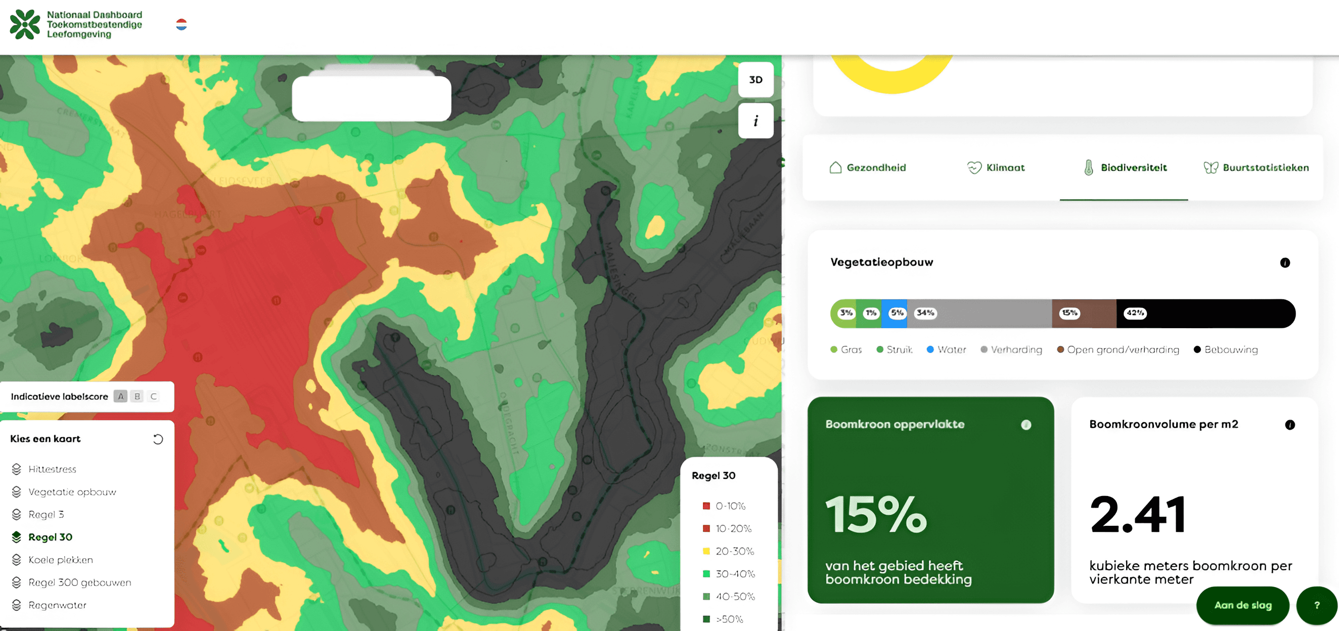 De data en kaarten op het NDTL bieden inzicht in de Nederlandse leefomgeving op het gebied van klimaat, gezondheid en biodiversiteit. Aan de hand van vijftien indicatoren krijgen gebruikers van het dashboard vlot inzicht in de stand van zaken in een bepaalde wijk of buurt.